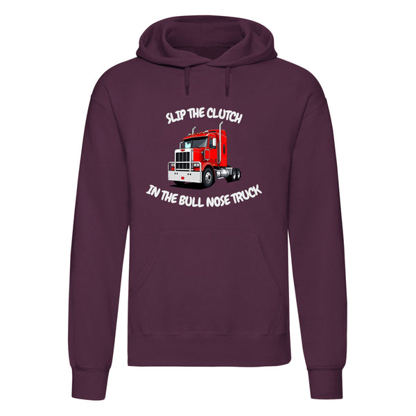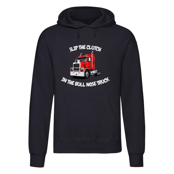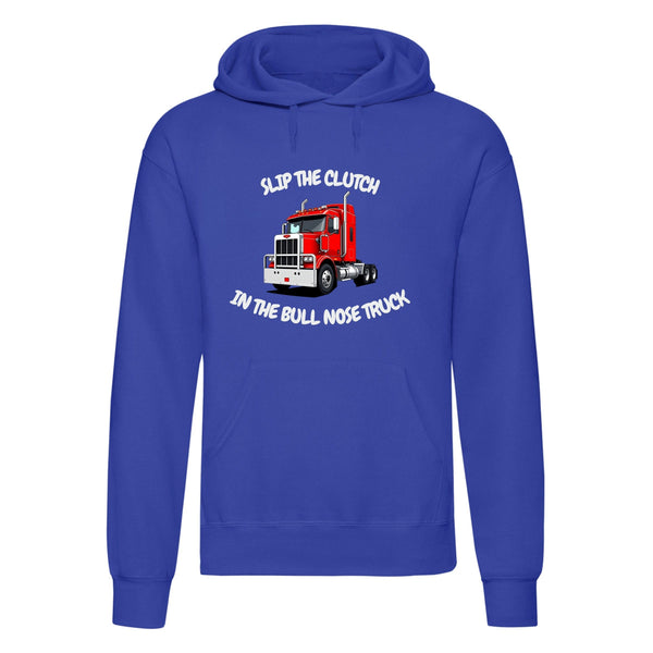SLIP THE CLUTCH IN THE BULL NOSE TRUCK hoodie, perfect for truck enthusiasts. The hoodie is made from a durable 50% polyester and 50% cotton blend, giving you a soft yet sturdy feel.